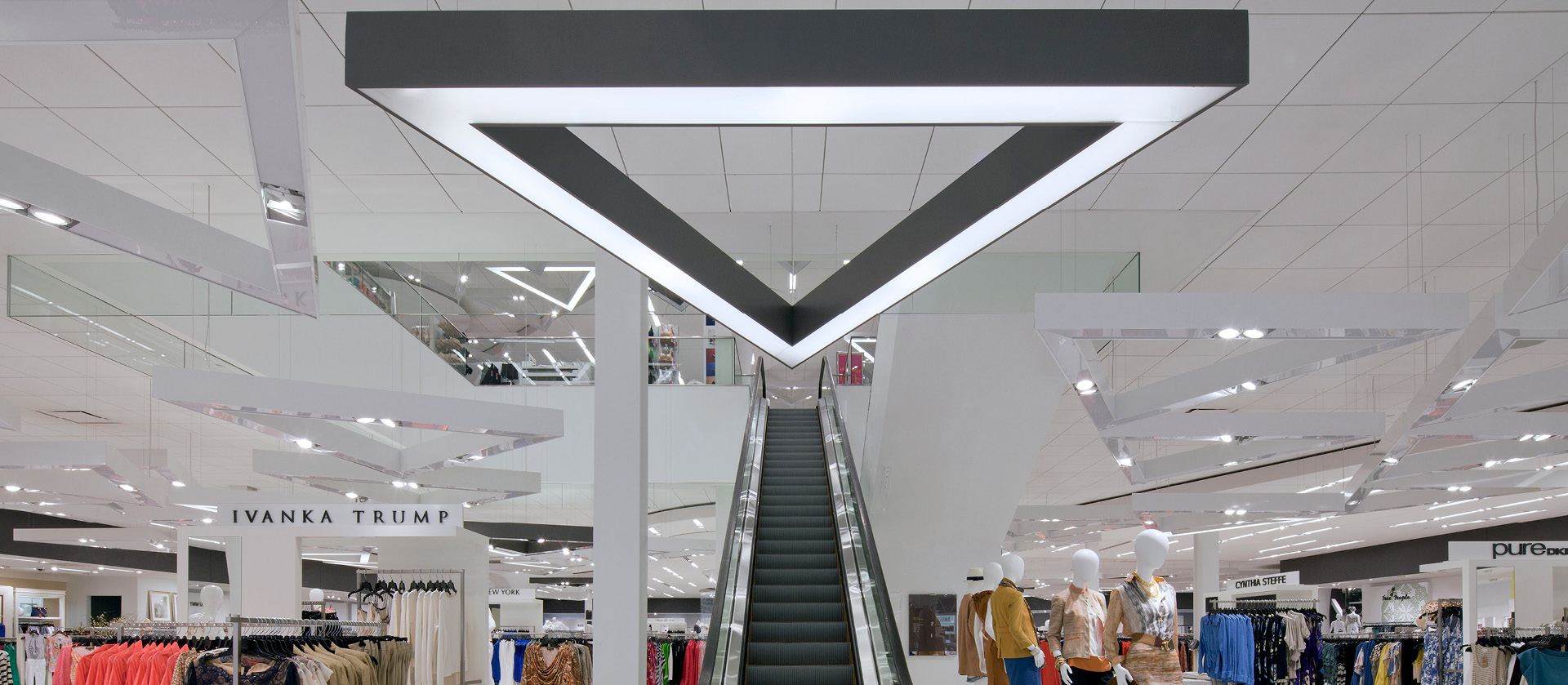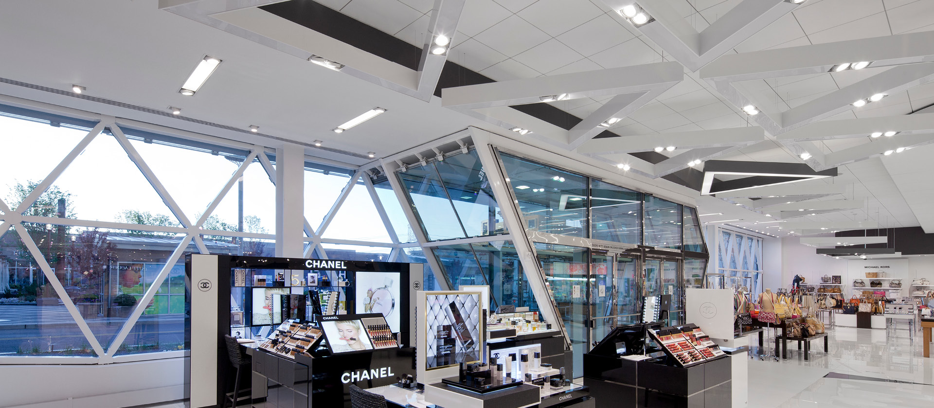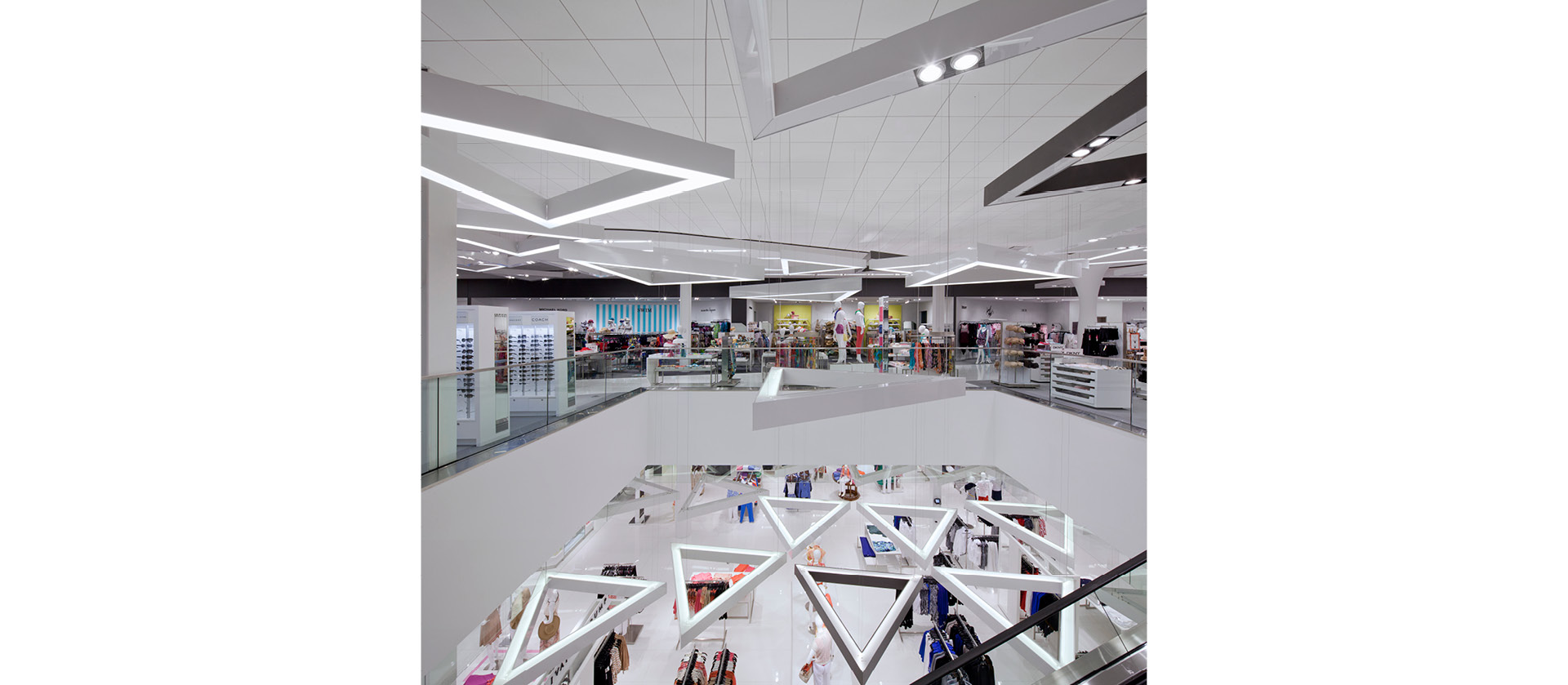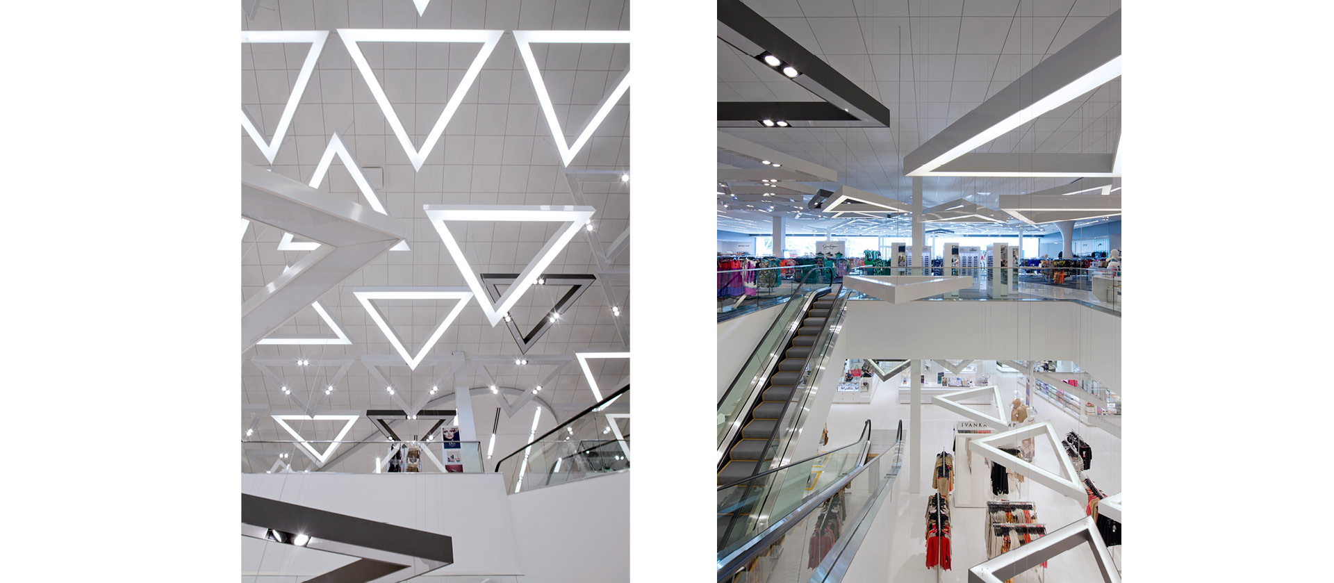 Reggiani USA, headquartered in New Jersey and operating in the American market for 20 years, was involved in this exciting “New Concept” for Lord & Taylor in 2012. It supplied a custom lighting system integrating high-end LED, metal halide, fluorescent technologies and structurally echoing the triangular pattern of the building’s façade. The resulting roughly 2.6 m-sided modular triangular lighting structures can provide accent, diffused, direct and/or indirect lighting.