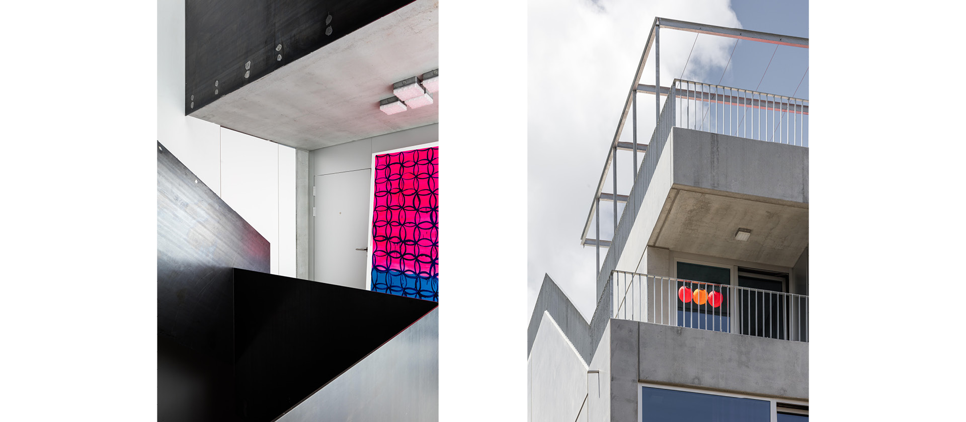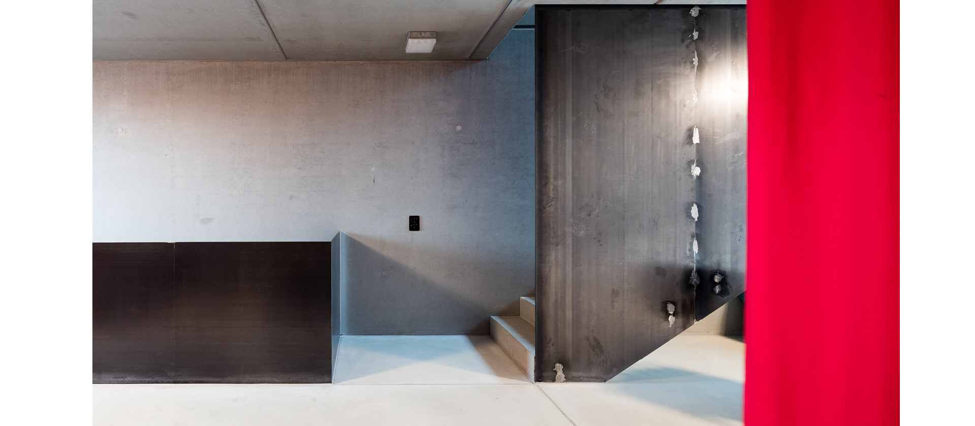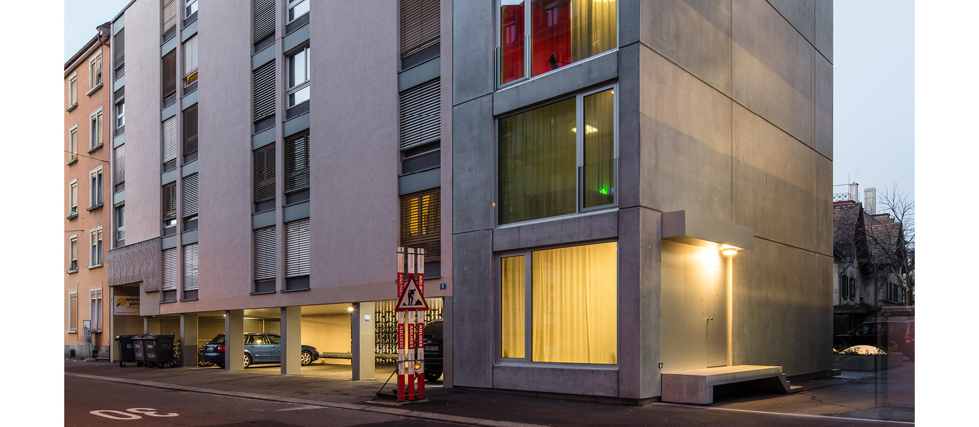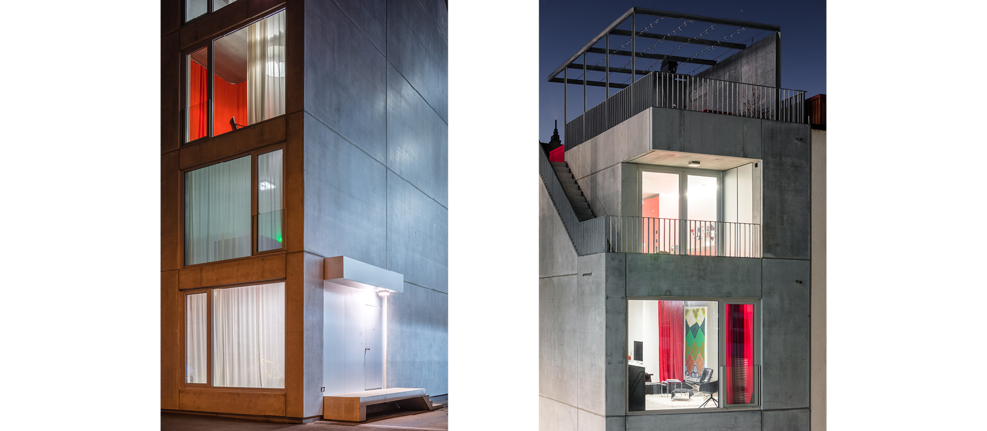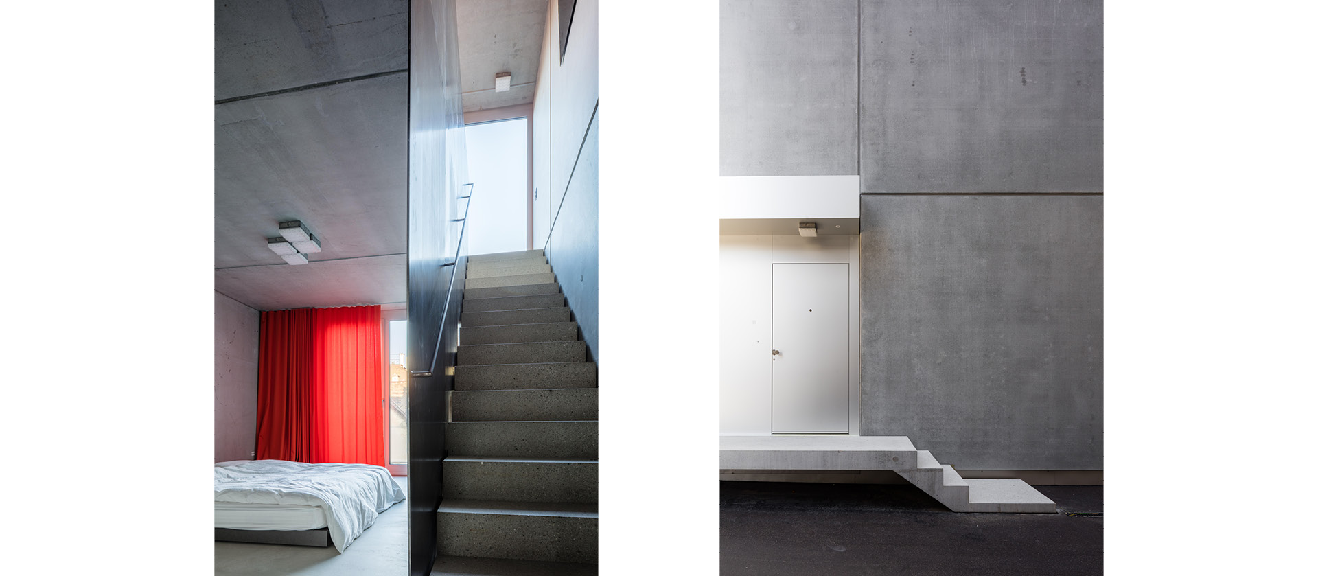 The objective was to utilise the courtyard of a pre-existing office and commercial building in Zurich’s District 4 as optimally as possible, while practising cost-efficient construction as a means to make the newly built space affordable to rent. The tall, slim, new structure inconspicuously nestles up to the adjoining residential building. Concrete elements, prefabricated using optimised production techniques, form the envelope of the new single-family house and characterise its architectural expression, both inside and out. Thus, the building is a kind of “building shell”, which can be lived in without any compromises in terms of comfort or appearance. A “rough” aesthetic predominates, inside and out. The facade is characterised by the pattern of joints between the industrially manufactured concrete elements. Inside, a palette of various red hues brings out features that contrast with the grey colour of the “béton brut”.