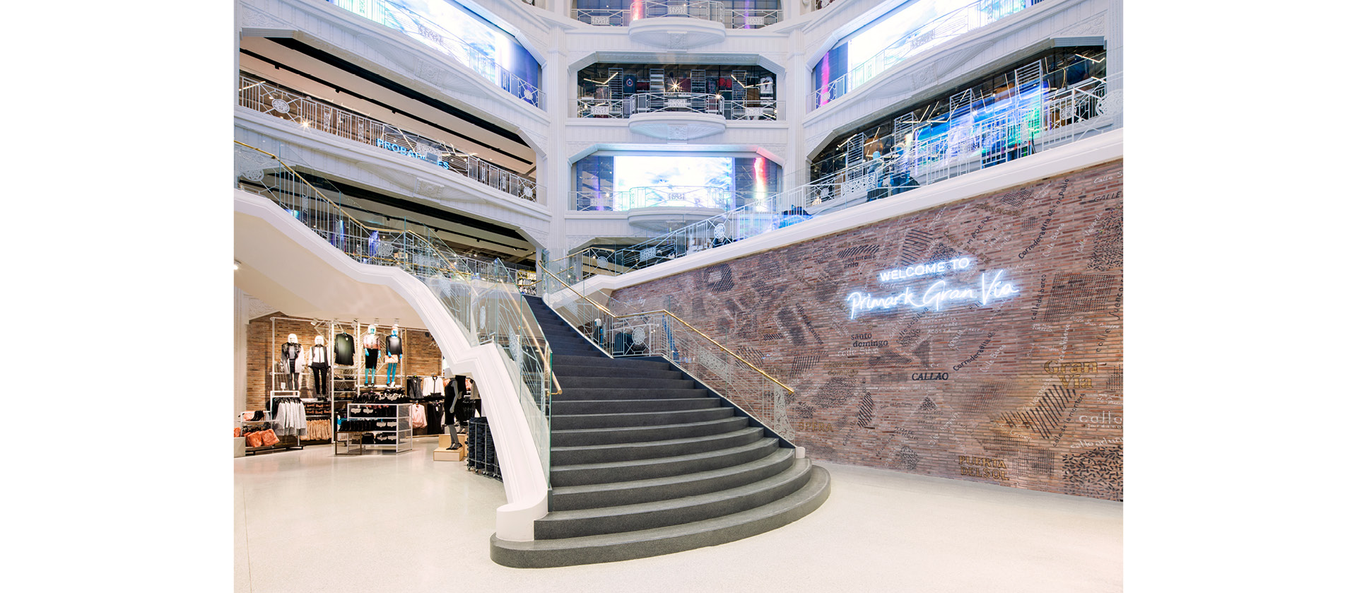 The store in Madrid´s archetypal Gran Vía is Primark’s second biggest outlet in the world, after Manchester, with five floors featuring a range of women’s and men’s fashion as well as homeware. It is also the fashion store’s most beautiful building and dates back to 1910 with some exceptional original features such as the glass dome that bathes the shop in natural light. The clothes are displayed on galleries that have balconies looking out onto a central atrium. The Gran Via is renowned for its sweeping grand building architecture which showcases a number of early 20th century styles including Vienna Secession, Plateresque and Art Deco.