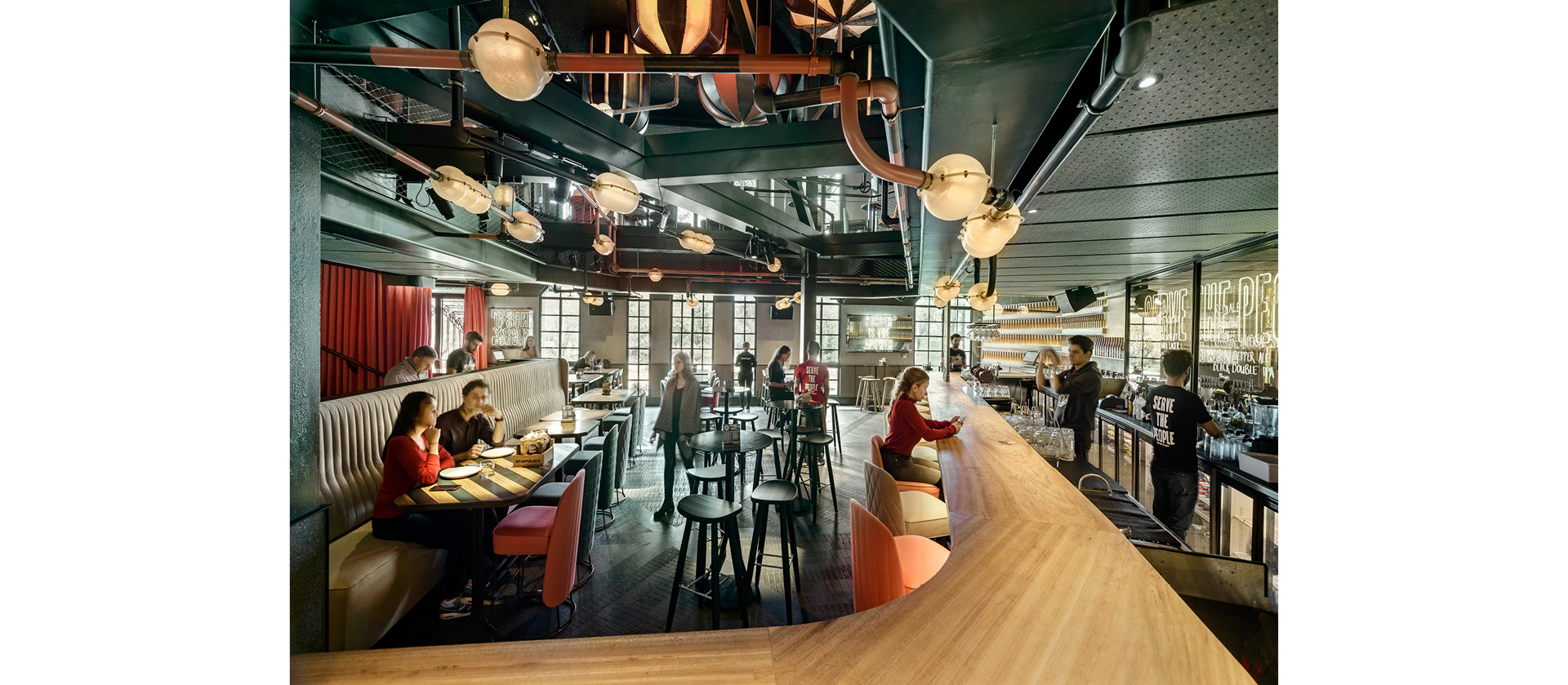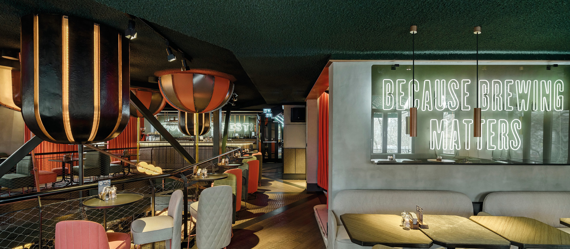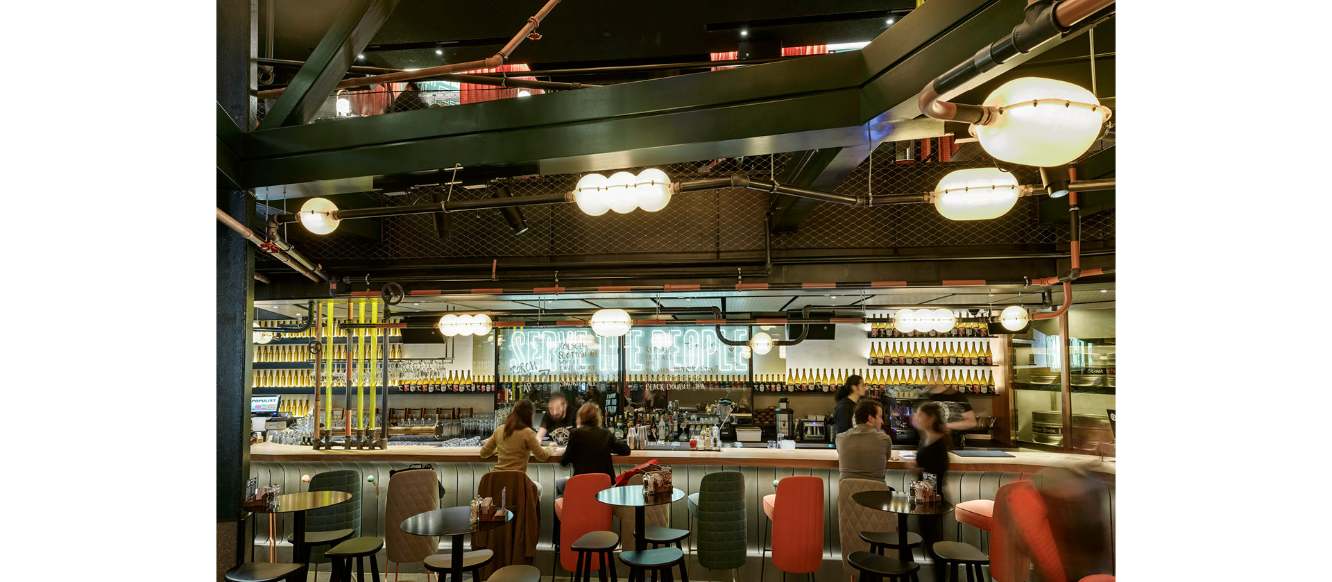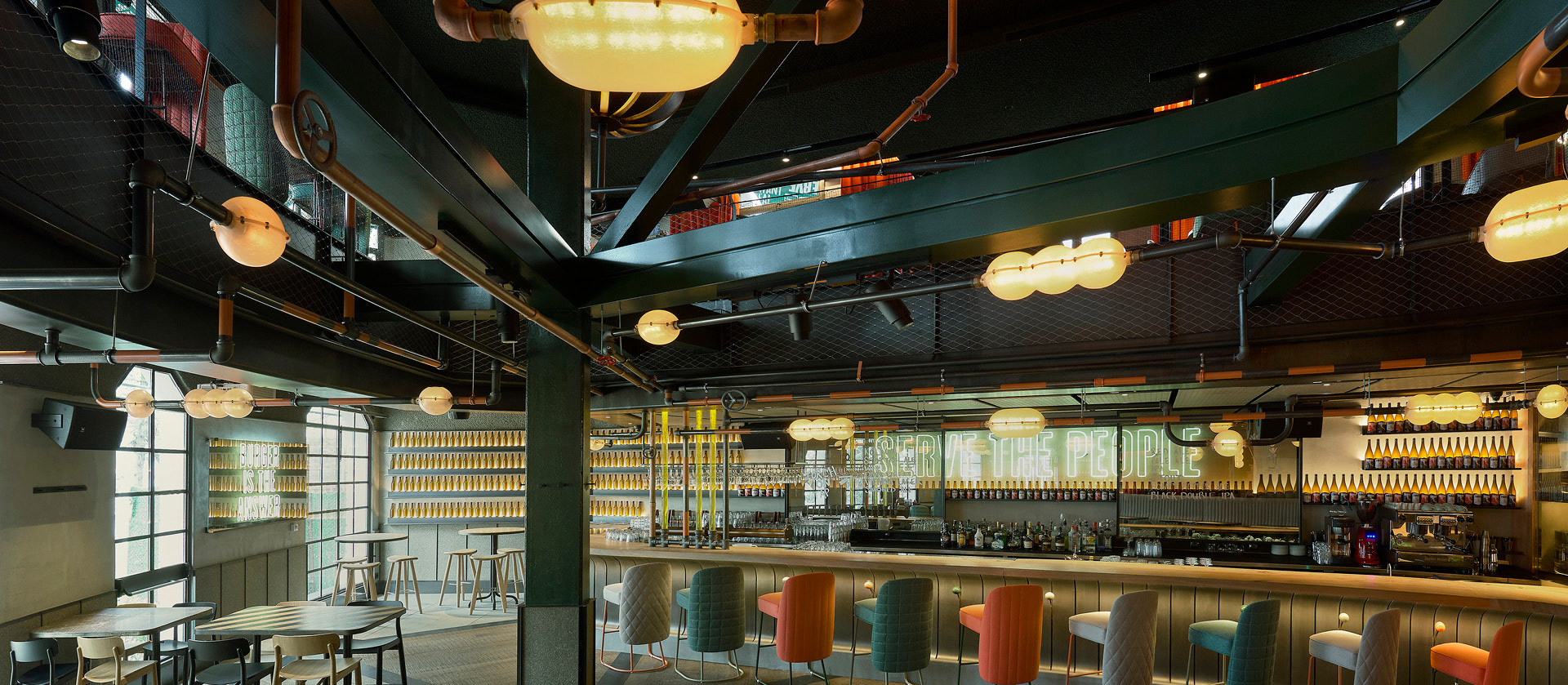 Yori Pendants, in the special brushed copper version with Dim-to-Warm COB (Kelvin temperature from 2000K to 3000K), were used for precision illumination of the restaurant’s tables, creating different ambience depending on the time of day and the brewery service. And Yori Track provides precision and general lighting in various areas of the space, used with and without barn-doors and with light beams of different widths.