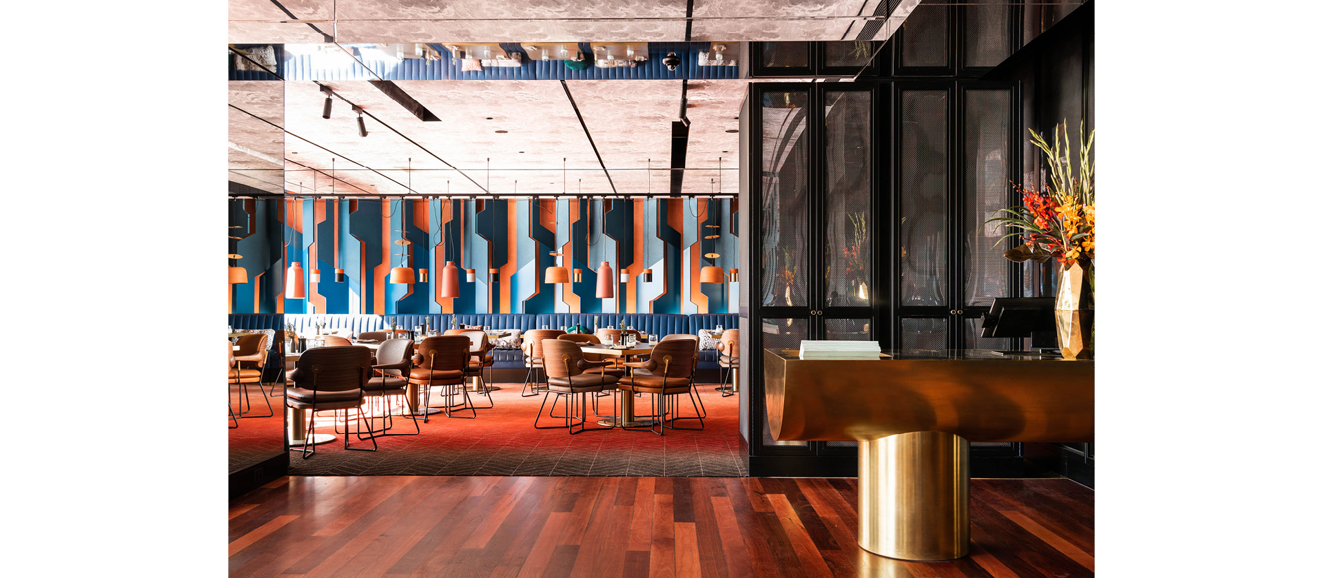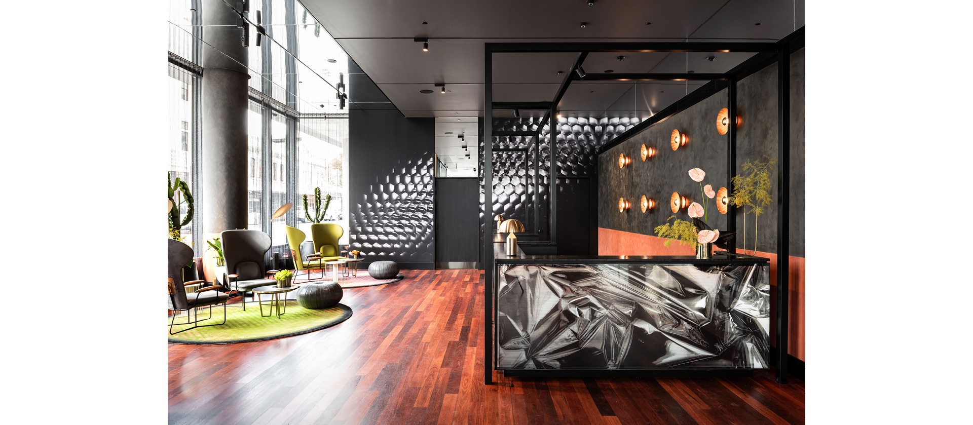 Event Entertainment and Hospitality under the vision of David Seargeant has brought together this new QT hotel with the collaboration of Candalepas + Associates on architecture, Nic Graham + Associates on front of house interiors and Indyk Architects on guest room and apartment interiors. Indyk Architects have also personally designed all interior elements on these levels – all joinery, bedheads, wardrobes, loose furniture, rugs, wardrobe handles, and the stitching details on chairs. Together with JEB International they studied a sophisticated system of panels and sliding doors to allow an almost seamless connection between bathroom and bedroom. The West Australian landscaped strongly influenced the color and finishes palette, that convey a sense of opulence and comfort together with the luxurious textiles.