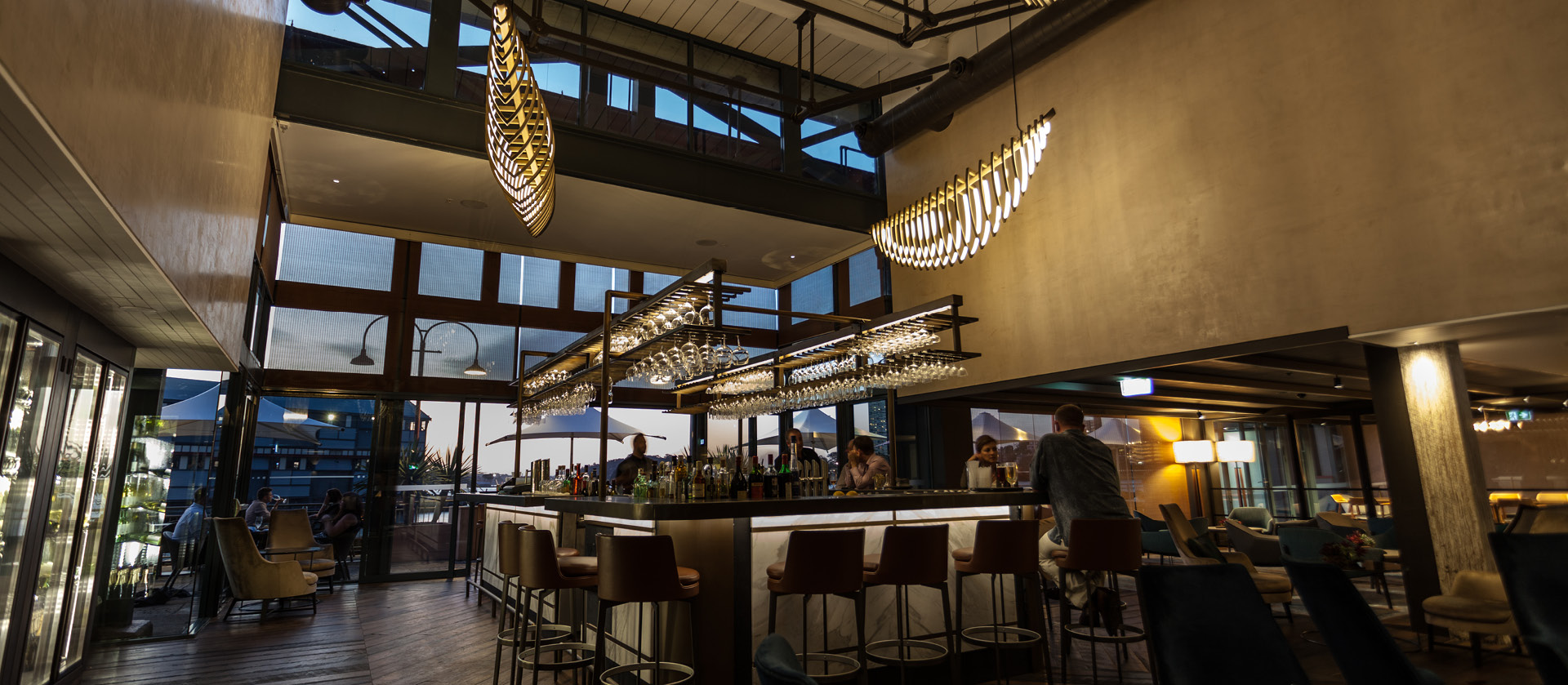It was agreed that the high space above the bar required a feature that worked with the nautical theme of the wharf and it’s history. Electrolight pitched an idea for a light-art sculpture, inspired by the organic form and movement of the ocean’s creatures and the way modern yachts replicate these same movements. The commissioned work, named ‘Squelette’, was both conceptualised and detailed by the Electrolight team in Sydney.