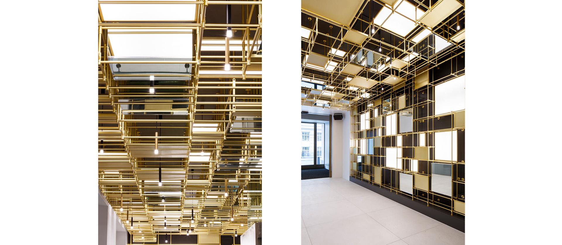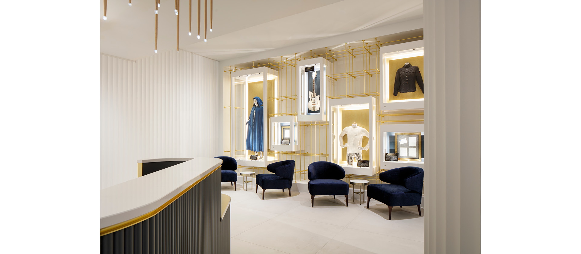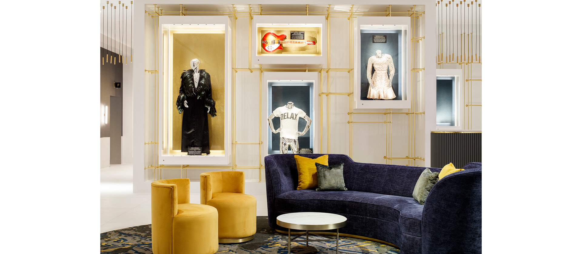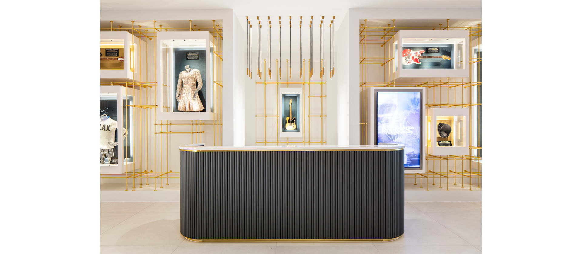 Nulty+ was responsible for creating the overall lighting design and the related sense of destination, both of which had to complement each individual space whilst also ensuring that the illumination used was precisely centred on the many pieces of iconic rock memorabilia on display.  The entrance lobby greets guests with a blast of rock-worthysensory stimulation that is generated by the juxtaposition of brass panels, rods and mirrors, ably supported by our narrow 2W wire-suspended Yori Pendant with a 28-degree medium beam in a striking mix of matt black and brushed gold finishes.  The luminaires themselves have been installed in an inverted U-shaped entrance space which fromthe outside offers a 3000k warm and welcoming lighting configuration thatbeckons and draws the visitor into the building and towards the reception area…