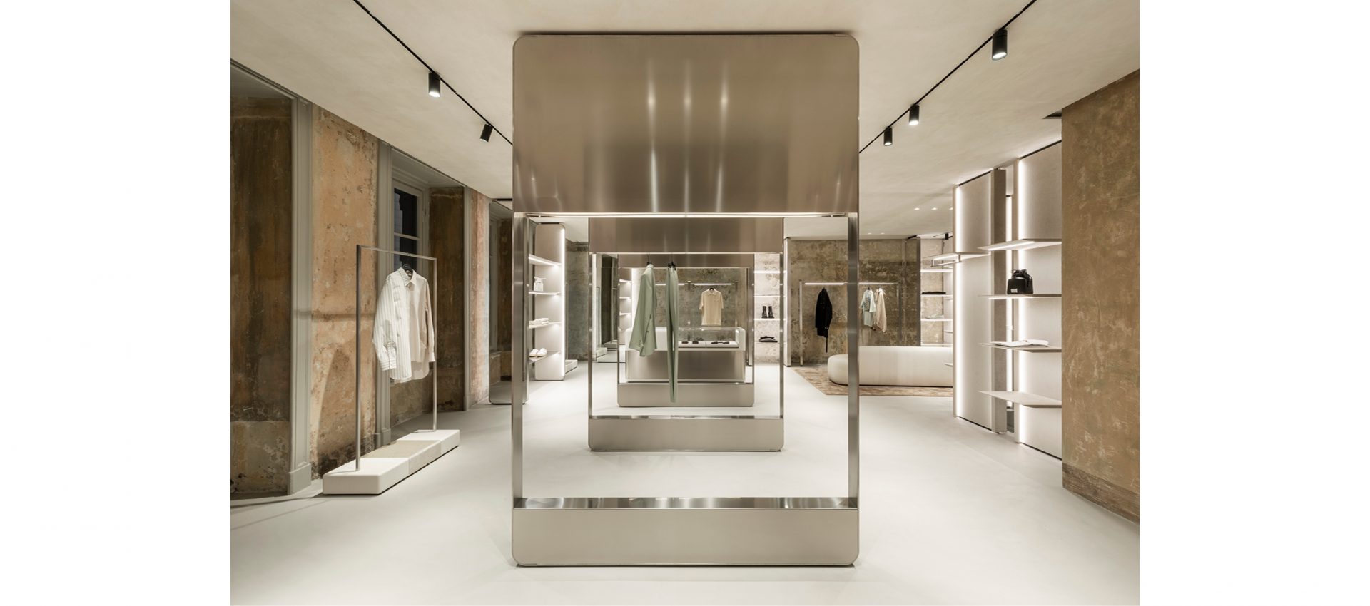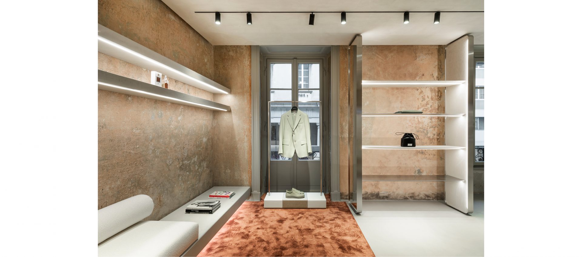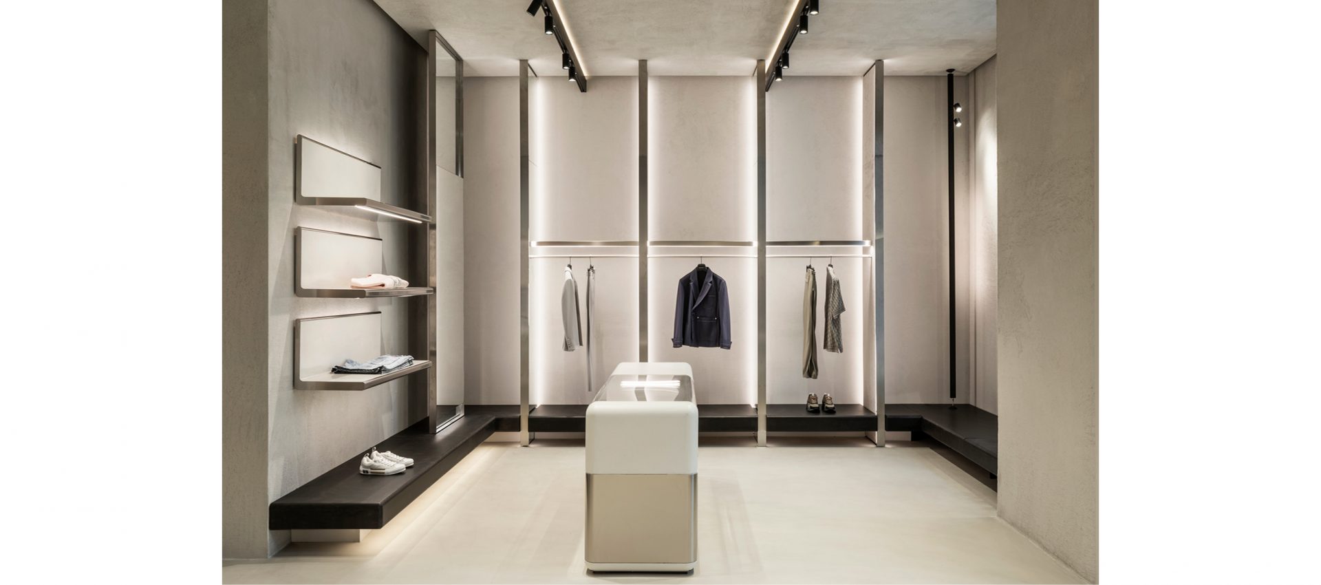 The lighting project completes the flagship store: the linearity of application of Yori Evo Ghostrack projectors, mounted on custom H track, follow the display of the collections available for sale in the store.