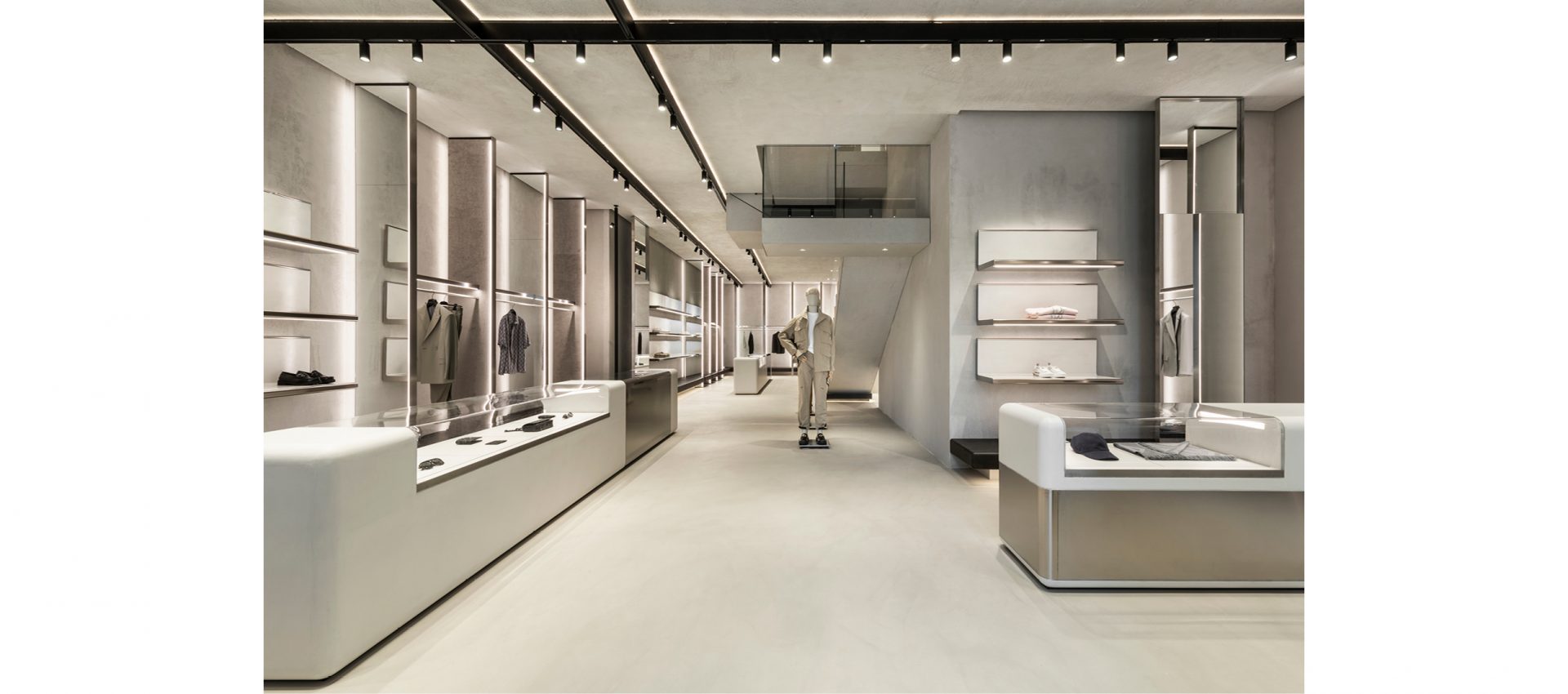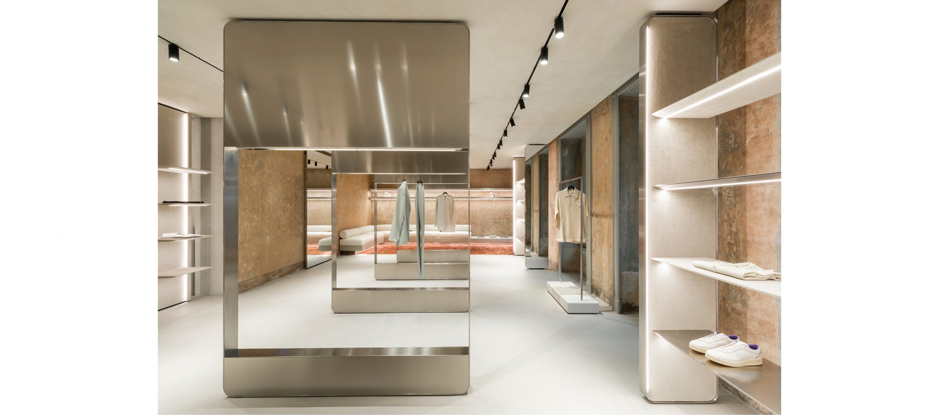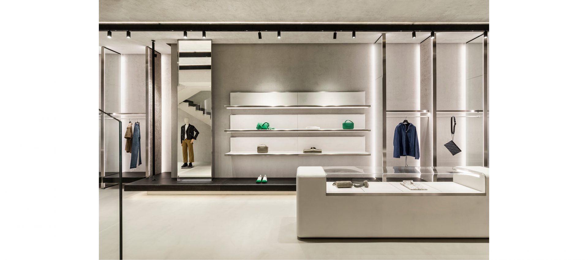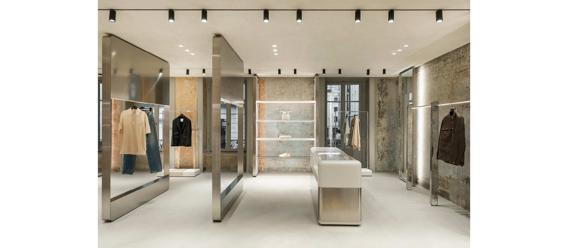 The lighting project completes the flagship store: the linearity of application of Yori Evo Ghostrack projectors, mounted on custom H track, follow the display of the collections available for sale in the store.