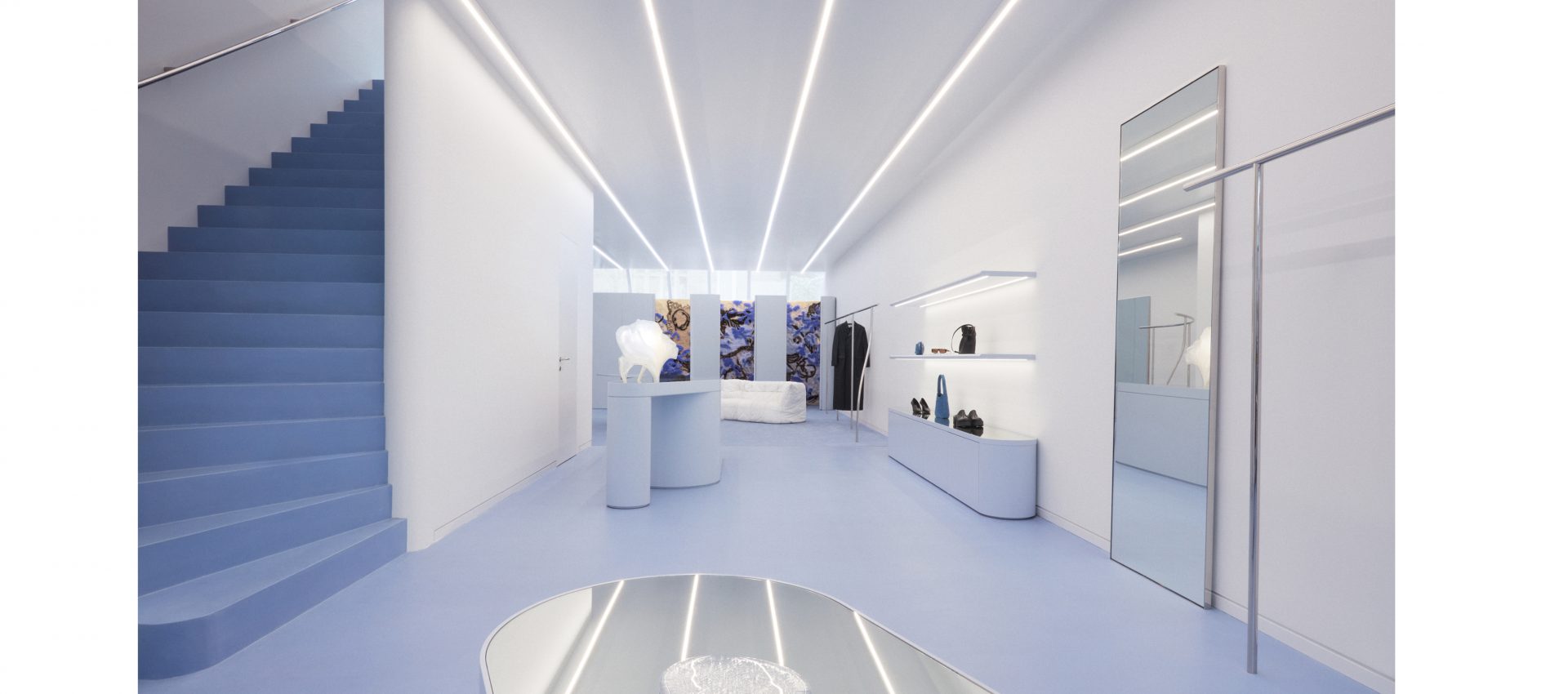 The lighting project frames the store: Traceline Surface runs all along the ceiling, creating an infinite perception, and a coherent lighting result. Traceline Surface in 3500K assures a neutral light temperature, and works in combination with the icy-nordic inspired furniture and colour palette.