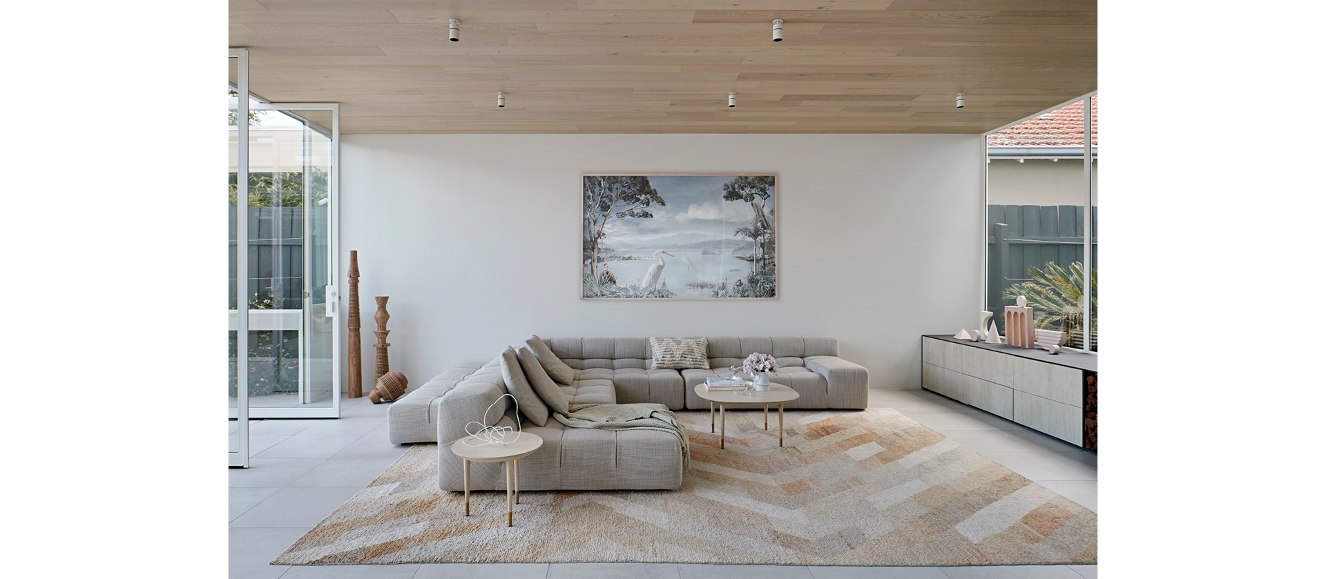 The concept of the “White house” is a soft, easy space in which to live. By using a natural palette and materials, the viewer has minimal distractions when moving through the space. The features become the grand double height voids, internal atrium garden, and the textured furniture that were carefully selected to complement the pale, pastel tones of the house.