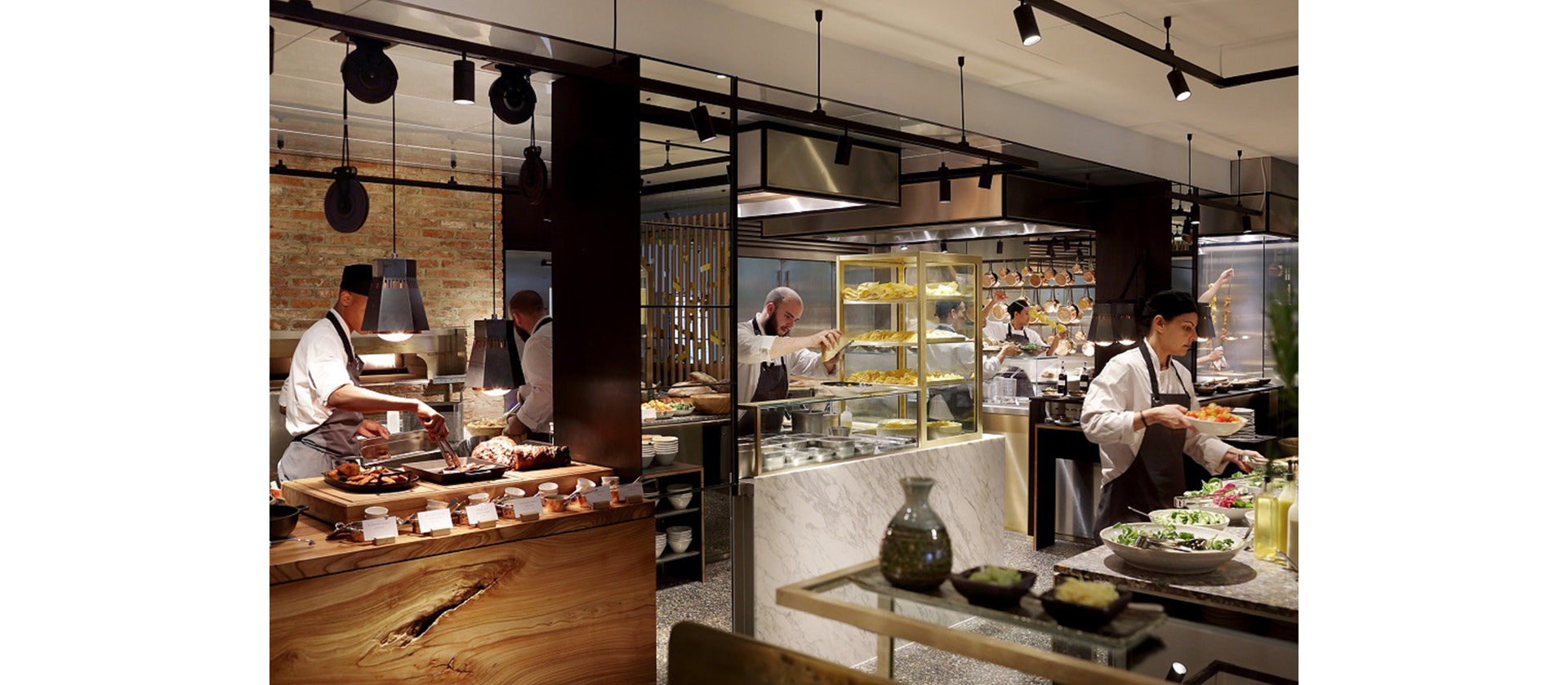 A carefully selected number of our embossed matt black 60mm Yori Evo Ghostrack fittings give purpose to every length of track. Each fitting has individual beam angles ranging from a tight 12 degrees to a wide 39 degrees but all spotlights are fitted with the appropriate Precision or Performance lens and diffuser so as to deliver the exact lumen output desired to each section of the food on display or working surface below. In this way, guests are able to personally follow the finest highlighted detail of their food preparation by suitably accomplished chefs or simply make their choice, return to their table and enjoy.