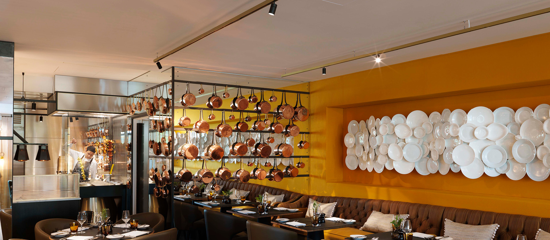 In the seating areas, Kate and Sam had Reggiani specially create a bespoke brushed brass-finish track to complement the decorative matt brass surround. Here the luminaire of choice was the smaller, 43mm Yori Evo 48V complete with a precision lens to pick out all the specialities and delicacies on each table.