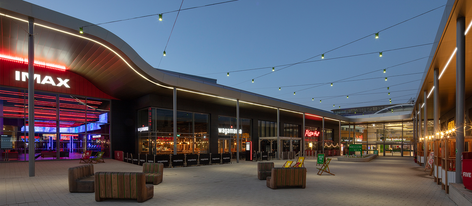 The Village is a £13.7 million addition to The White Rose Shopping Centre in the Beeston area of Leeds, West Yorkshire. The new extension includes an 11-screen cinema, operated by Cineworld IMAX, a children’s play area and six new restaurants all set in a stylish outdoor community space where visitors can interact, dine al fresco until late or simply sit. The area will also be used to host seasonal events to offer shoppers fun, full-day experiences besides bringing the community together. With our Envios projectors we created a stunning lighting solution that is efficient and flexible within a unique and eye-catching criss-cross suspended grid design.