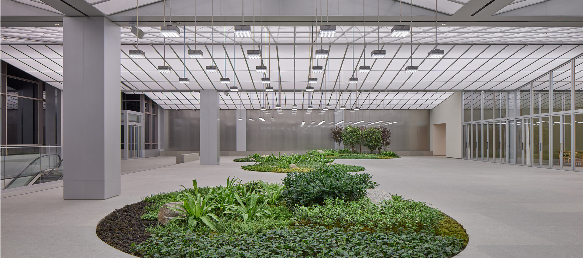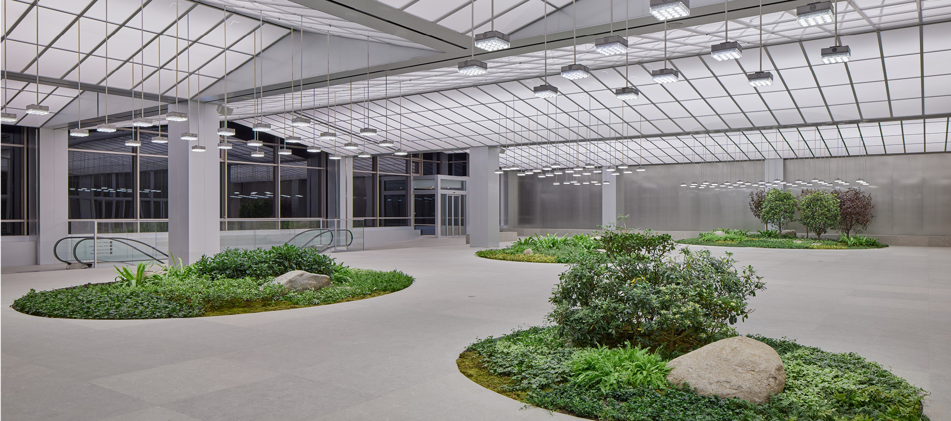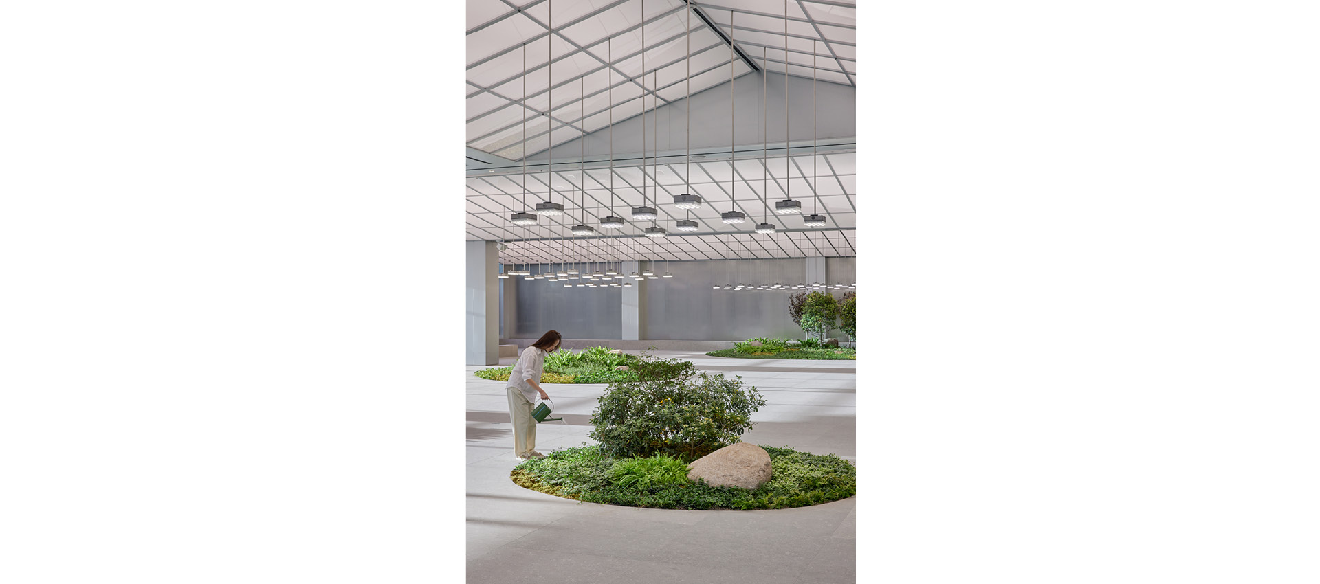 The ‘Glass Haus’ at the 7th Floor of Hyundai Mokdong Department Store is a contemporary interpretation of the traditional green house, extending the external roof garden into the indoors. Designed by Casper Mueller Kneer Architects, It’s a space without fixed use, inviting customers and local residents to relax while bearing flexibility for potential future events. A series of green islands with lush planting are scattered around the space providing a calming and immersive experience. The feeling of sitting inside a greenhouse is enhanced by the back-lit pitched roof. More than a hundred custom Cells were carefully selected by Lichtvision to apply a biophilic design idea with additional focused grow lights above the planting.