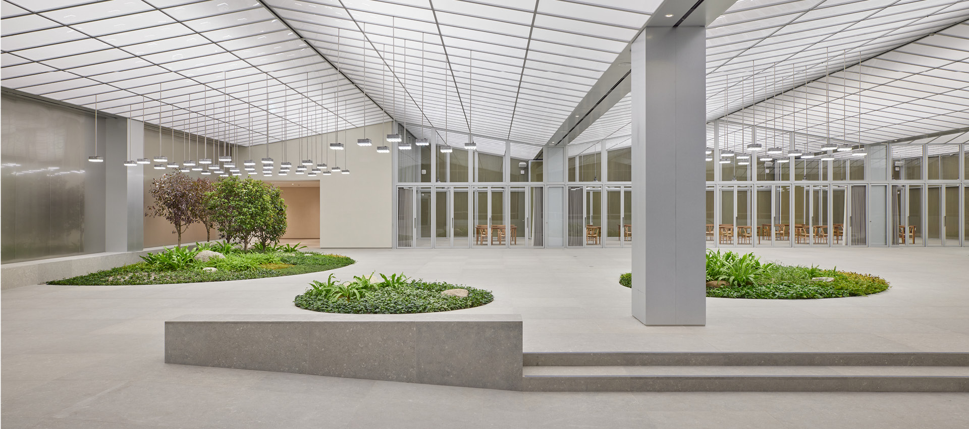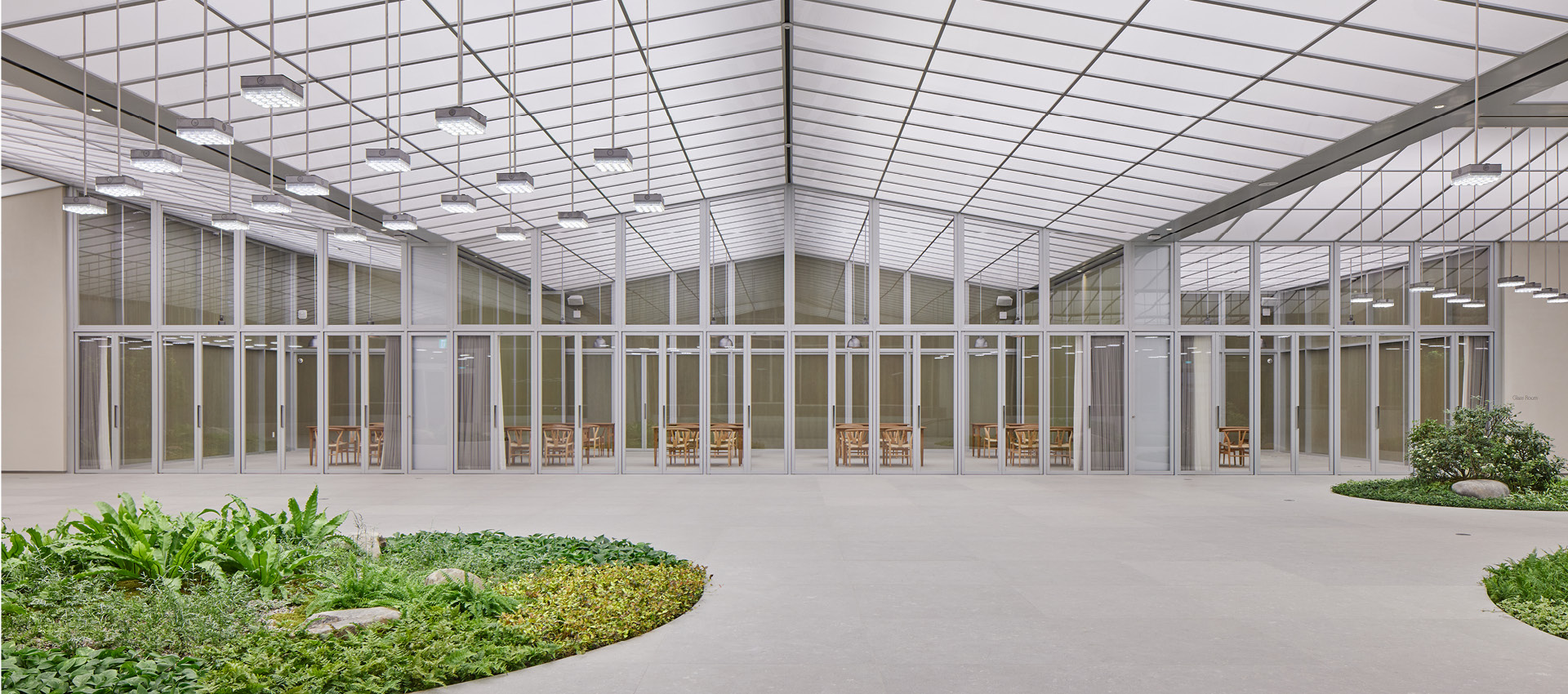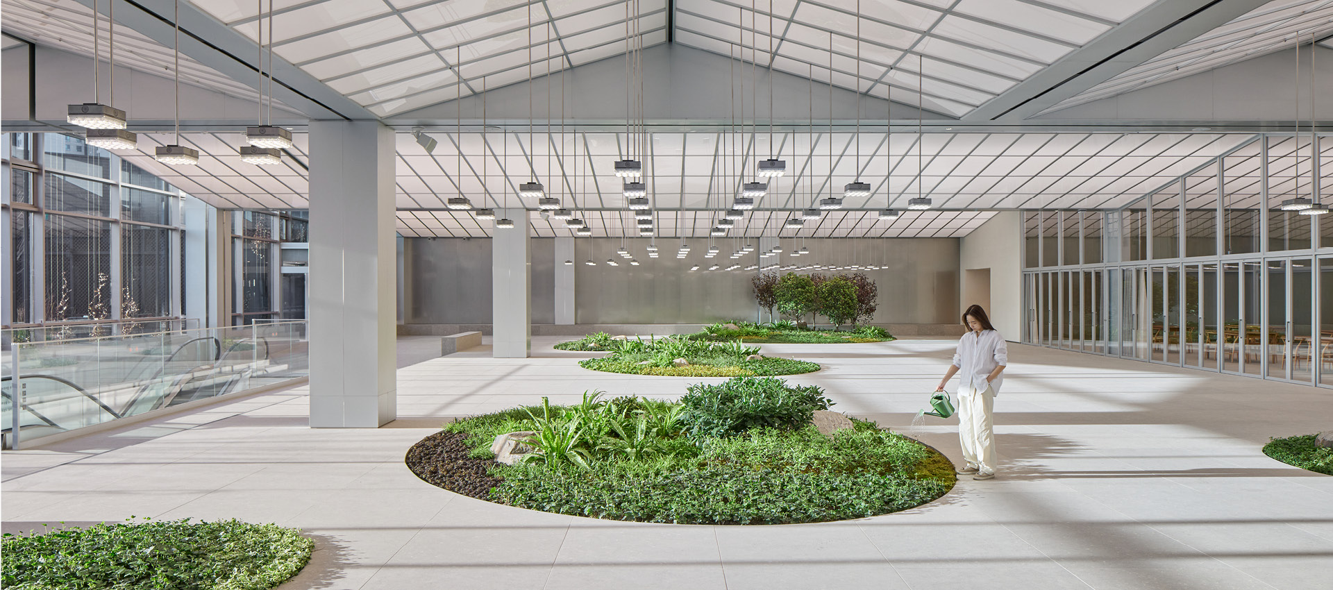 The ‘Glass Haus’ at the 7th Floor of Hyundai Mokdong Department Store is a contemporary interpretation of the traditional green house, extending the external roof garden into the indoors. Designed by Casper Mueller Kneer Architects, It’s a space without fixed use, inviting customers and local residents to relax while bearing flexibility for potential future events. A series of green islands with lush planting are scattered around the space providing a calming and immersive experience. The feeling of sitting inside a greenhouse is enhanced by the back-lit pitched roof. More than a hundred custom Cells were carefully selected by Lichtvision to apply a biophilic design idea with additional focused grow lights above the planting.